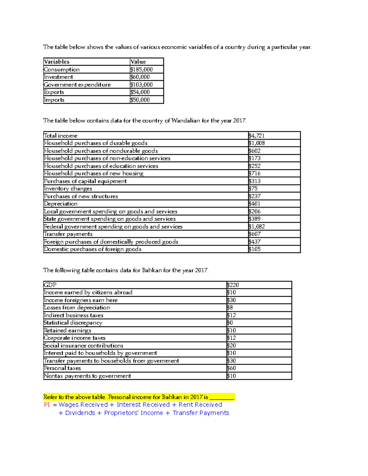 In the economy of Talikastan in 2015 consumption was 600 exports were 300 GDP was 1300 government purchases were 250 and investment was 300. In New York and 15 other states personal income resumed growing in the second quarter table A. Income foreigners earn here.